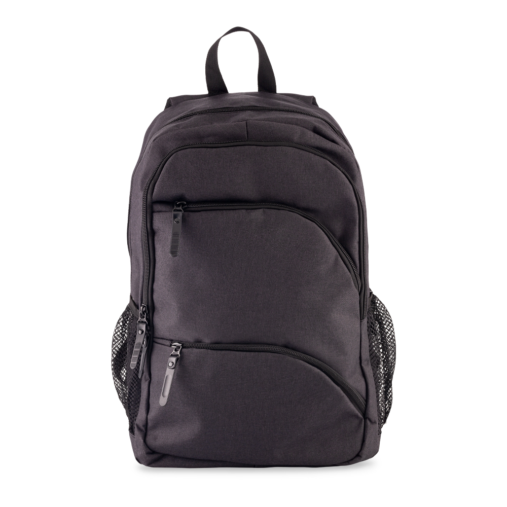 Morral backpack en poliéster, con dos bolsillos laterales de malla y cuatro frontales con cremallera. Apto para portátil de 15”. Incluye reata posterior para adaptar a trolley. Espaldar acolchado.