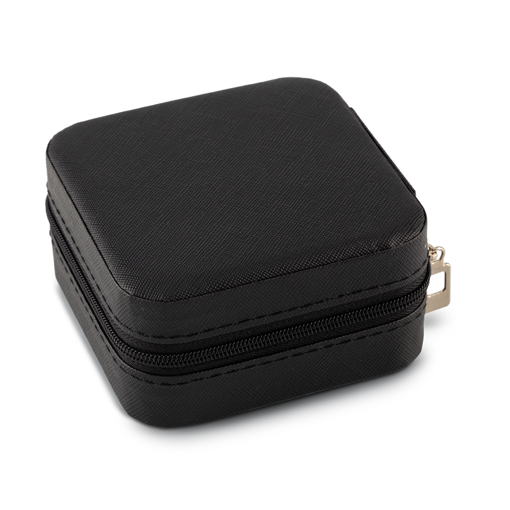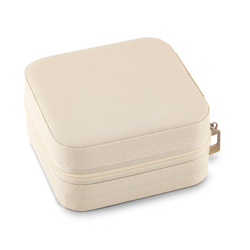 Joyero en imitación cuero con cremallera. La parte superior interna tiene 3 ganchos y un bolsillo elástico. La parte inferior interna tiene 4 compartimientos y 6 espacios para anillos. Empaque caja individual.