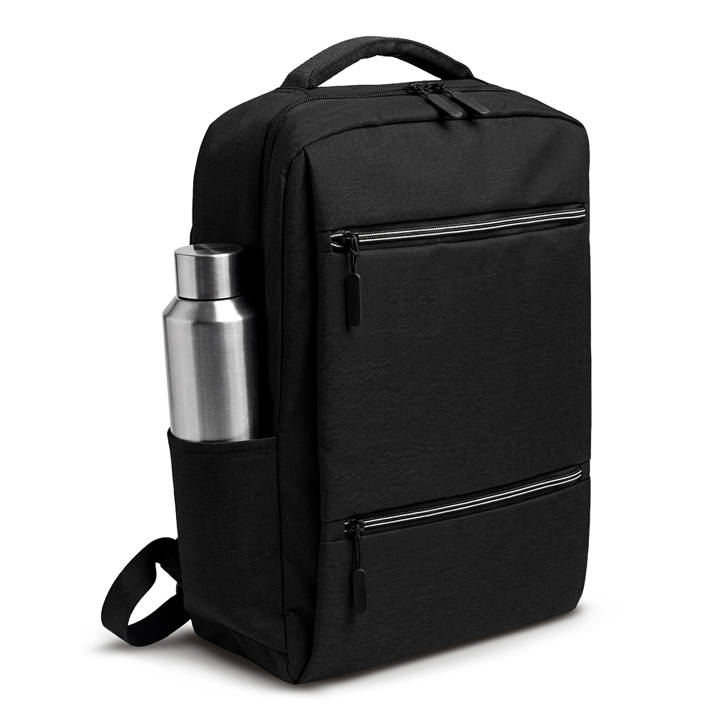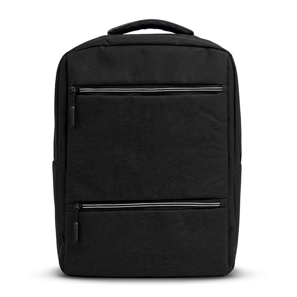 Morral en poliéster 600D, apto para portátil de 15”. Dos bolsillos externos con cremallera, un bolsillo lateral. Espaldar semi-acolchado.