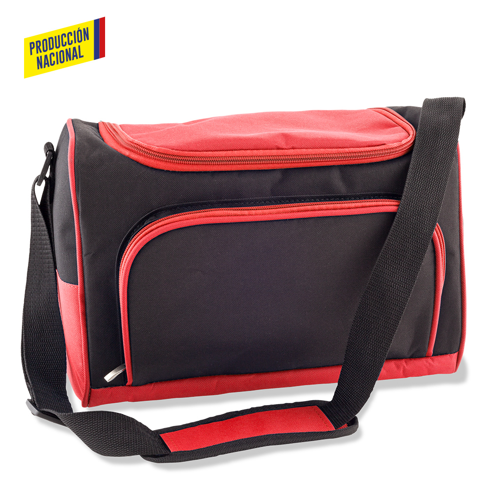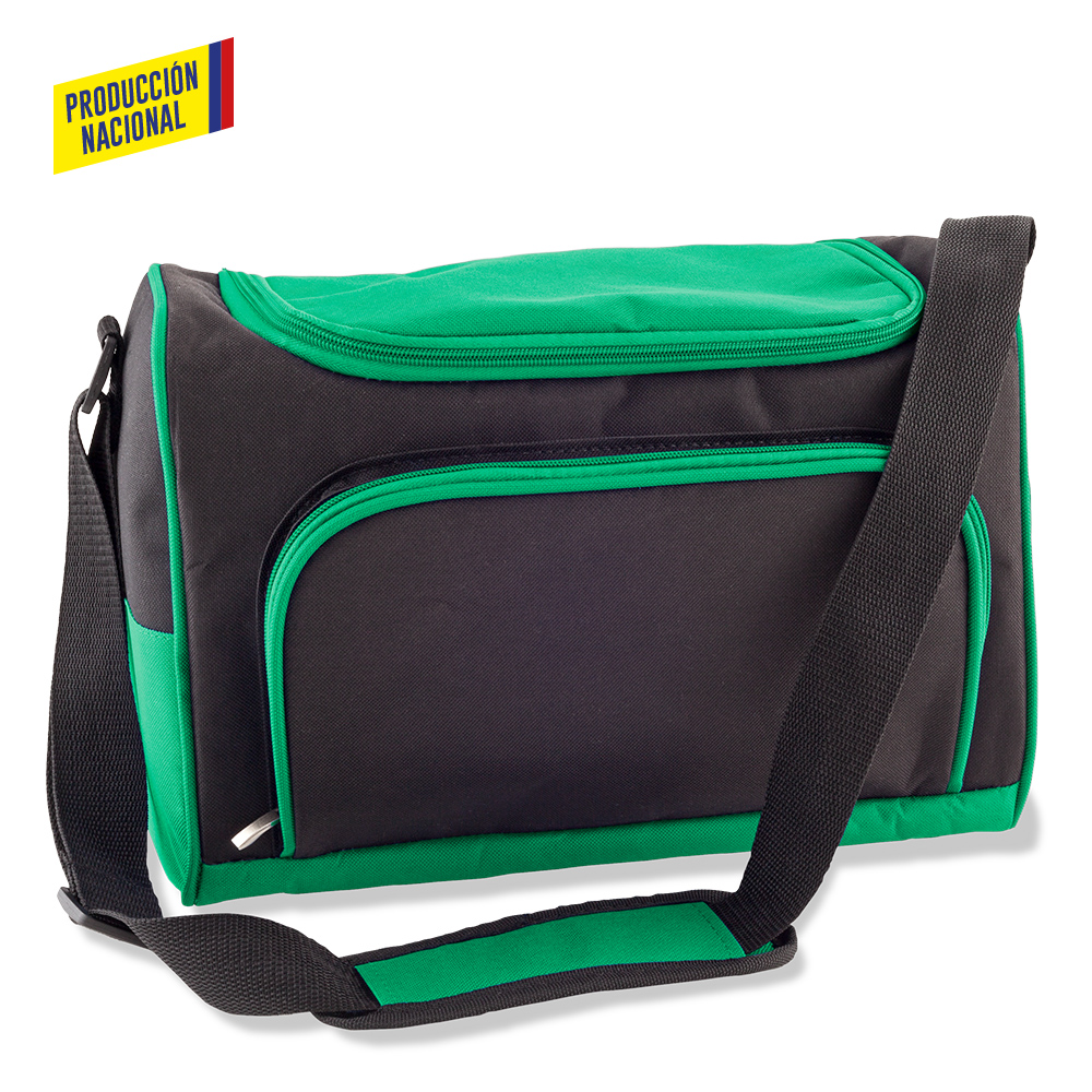 Nevera en poliester con bolsillo frontal de cremallera y recubrimiento interior que conserva las bebidas o alimentos frios por mas tiempo Correa ajustable para cargar