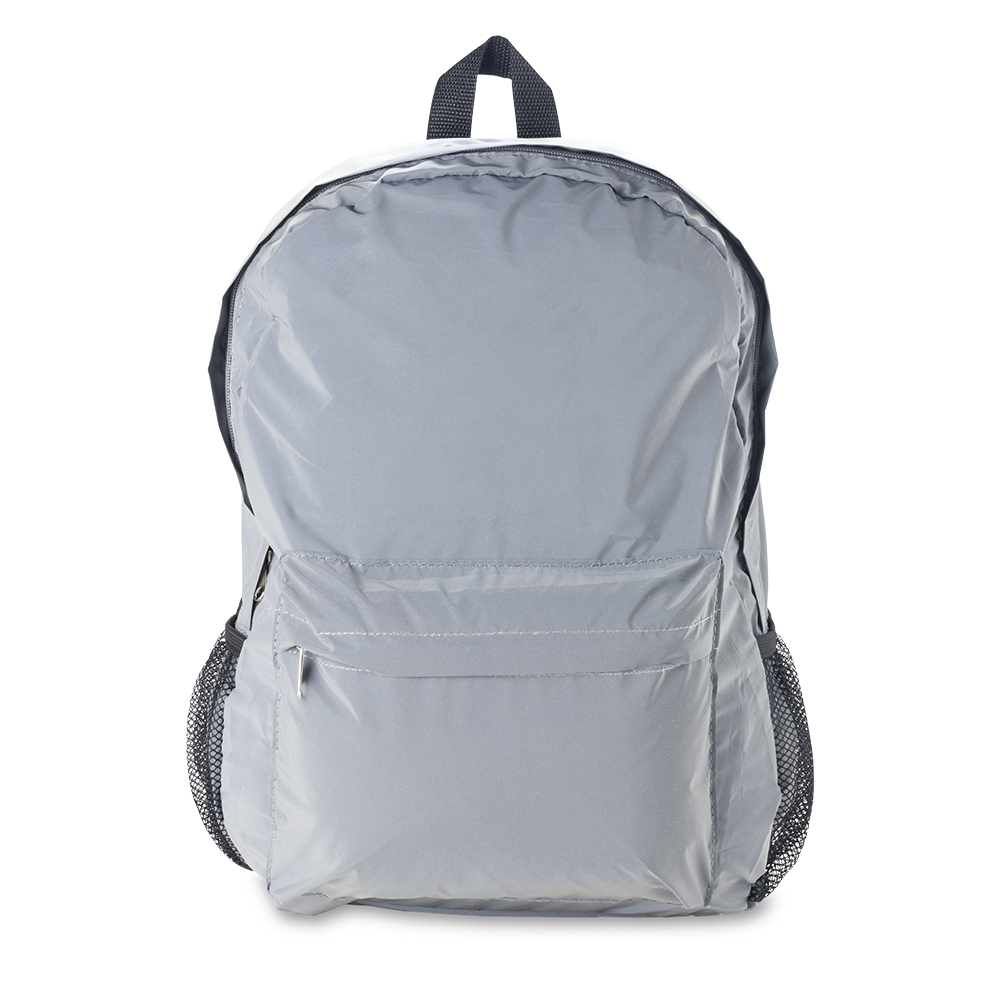 Morral backpack en poliester reflectivo con dos bolsillos y dos bolsillos de malla