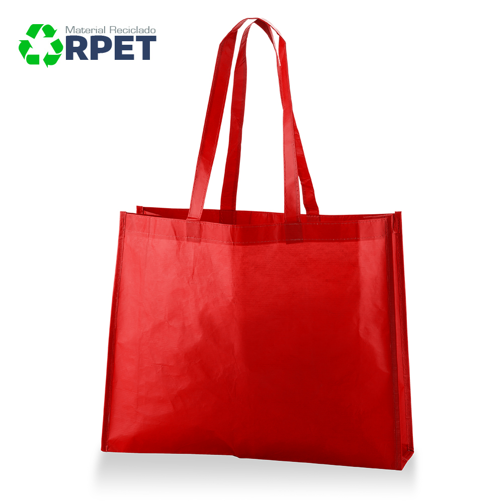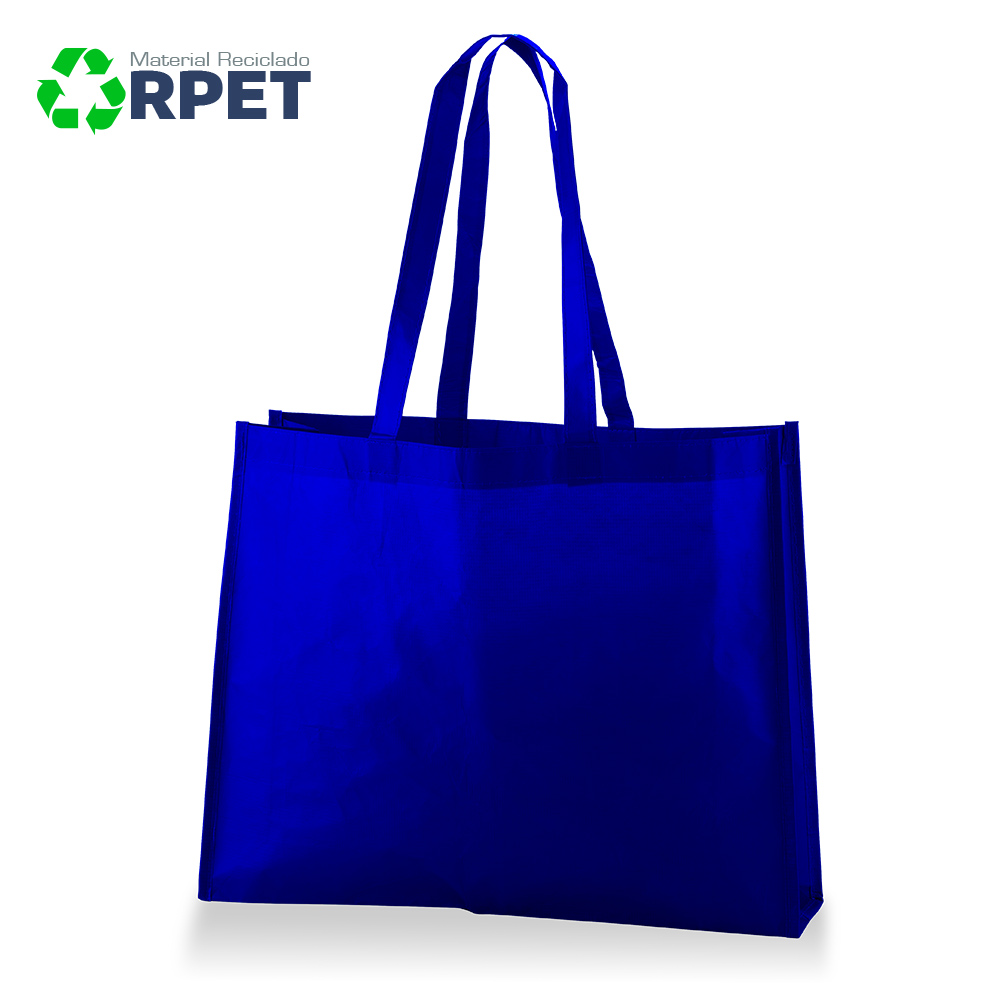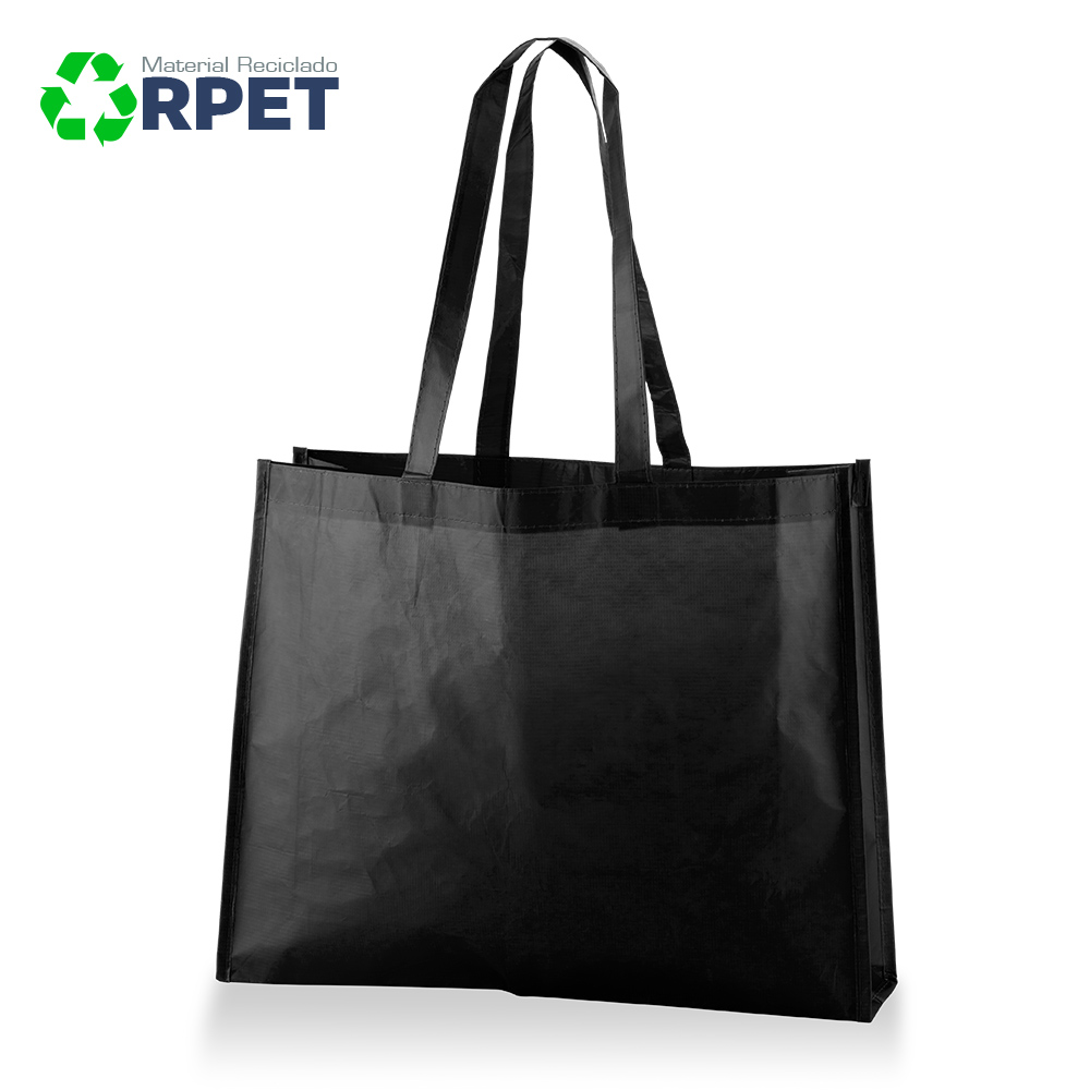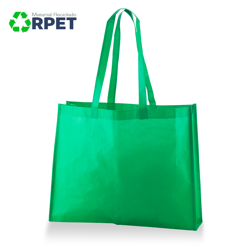 Bolsa fabricada 100% RPET (PET reciclado de botellas de agua) y manijas largas laminado mate Con costuras de refuerzo en X en las manijas 100% ecologica Medidas: ancho 45 cm x largo 35 cm x fuelle 12 cm