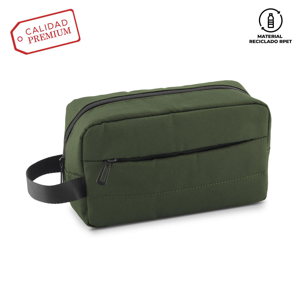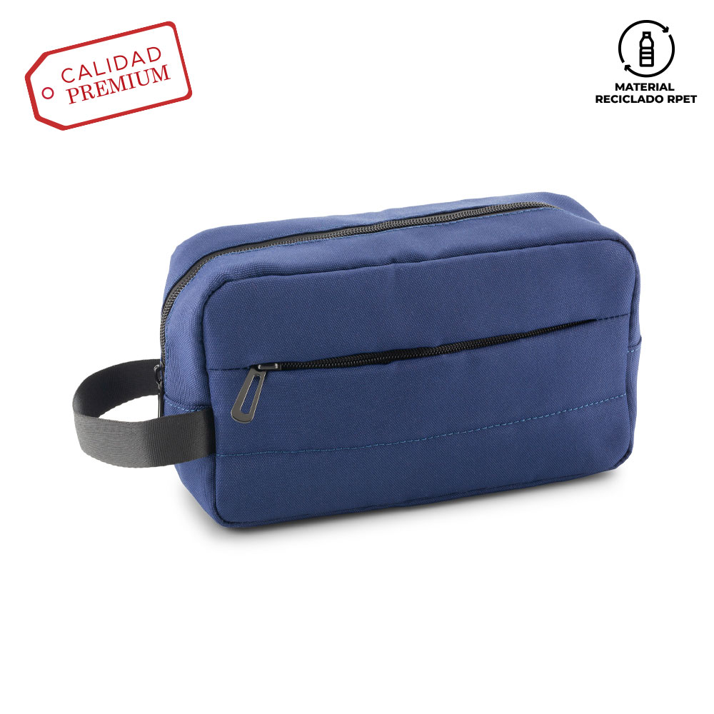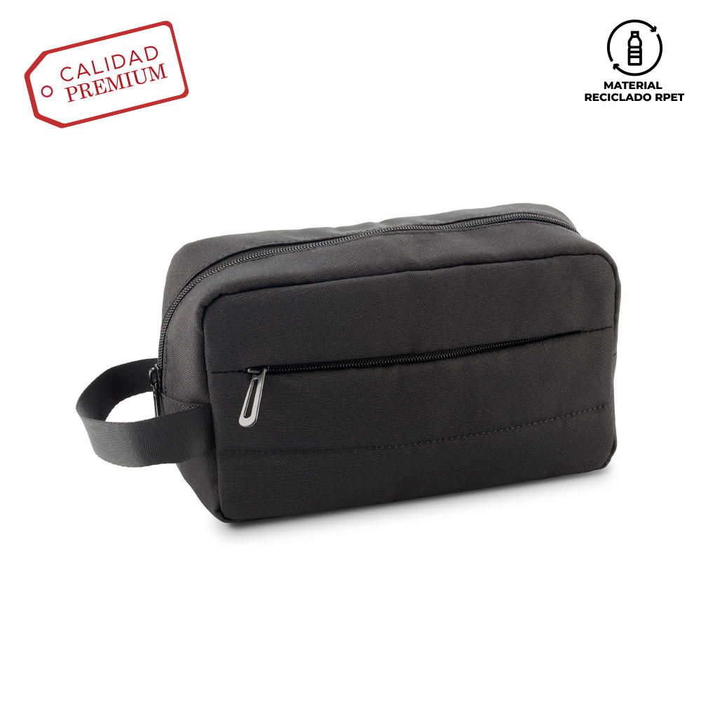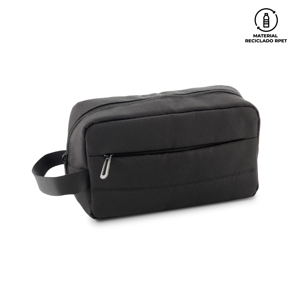 Organizador en poliéster reciclado RPET. Cuenta con un espacioso compartimiento principal, dos bolsillos adicionales (uno con cremallera). Interior y exterior 100% poliéster.