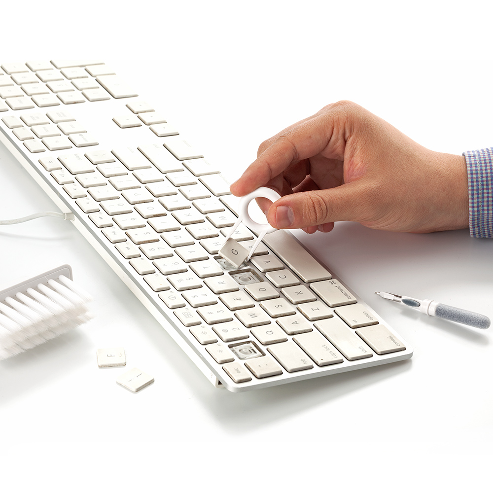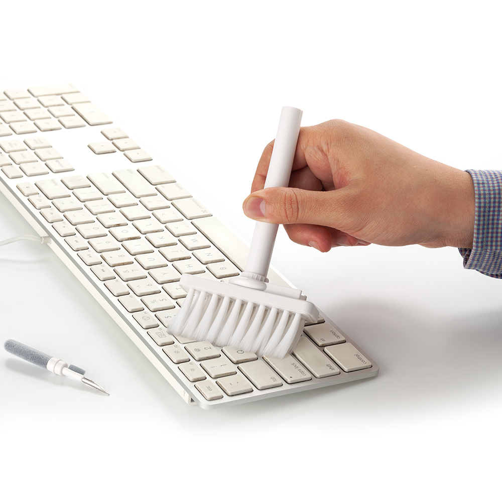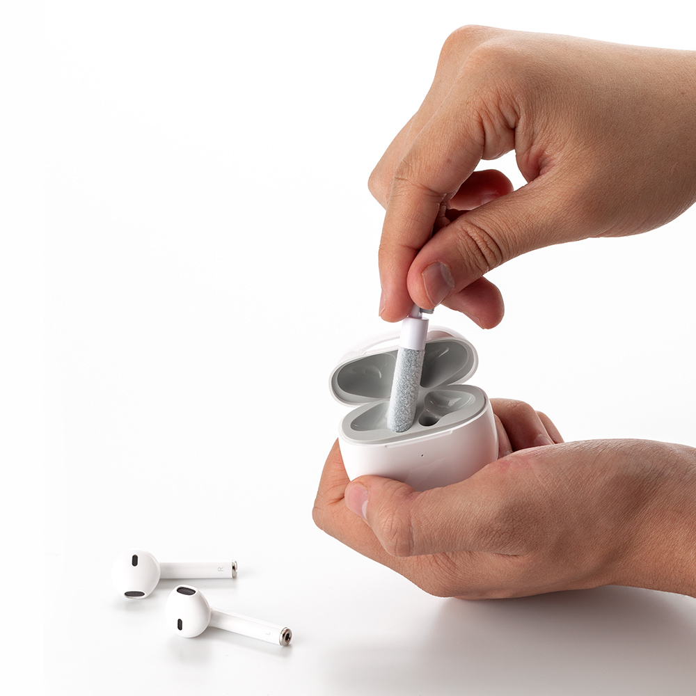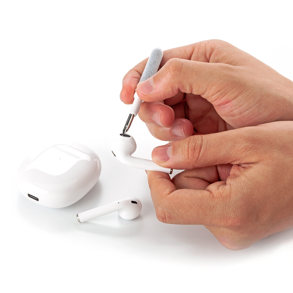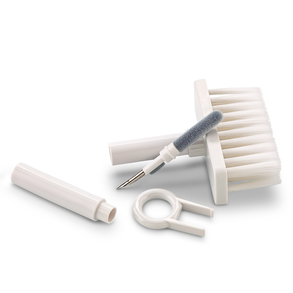 Set de limpieza multiusos que contiene un cepillo externo de cerdas suaves un mini cepillo fino y suave que limpia el compartimento de carga de la funda de auriculares un cabezal de cerdas densas para una facil limpieza del orificio de sonido de los auriculares y otras partes de los auriculares; una punta de metal para una limpieza profunda de grietas y suciedad de limpieza dificil y extractor de teclas Se usa como multiusos y para limpieza profunda de cada esquina del teclado y auriculares