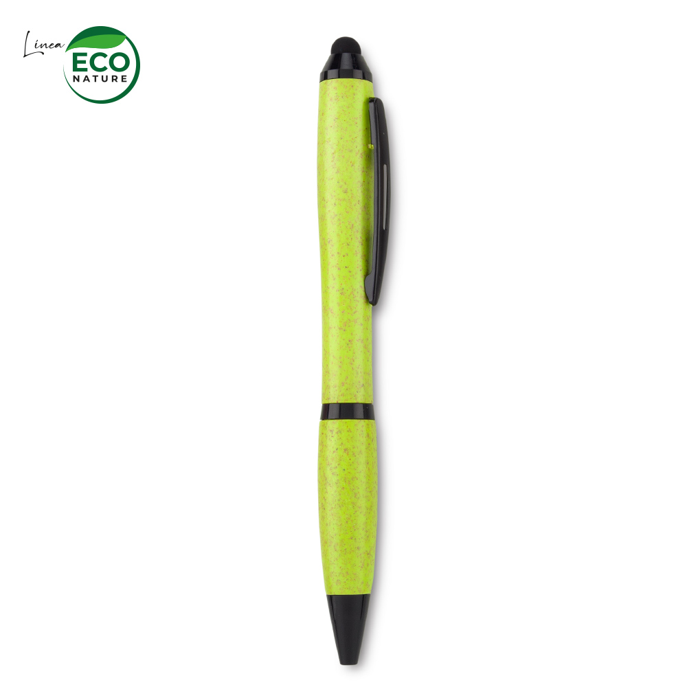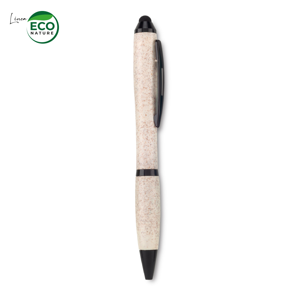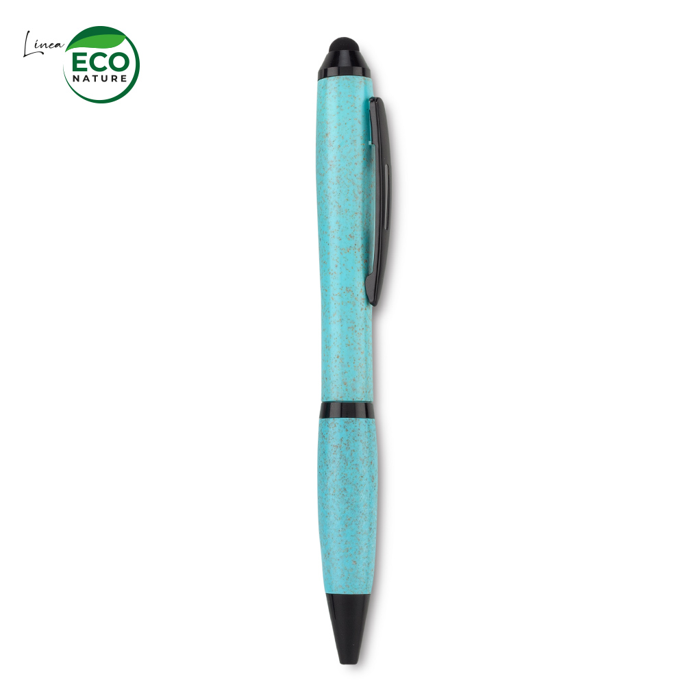 Boligrafo plastico con stylus Clip metalico Mecanismo twist Mezcla con material ecologico en fibra de trigo (50%-60% aprox) El porcentaje de material ecologico tiene un promedio de biodegradabilidad de 2-3 anos despues del fin de su vida util