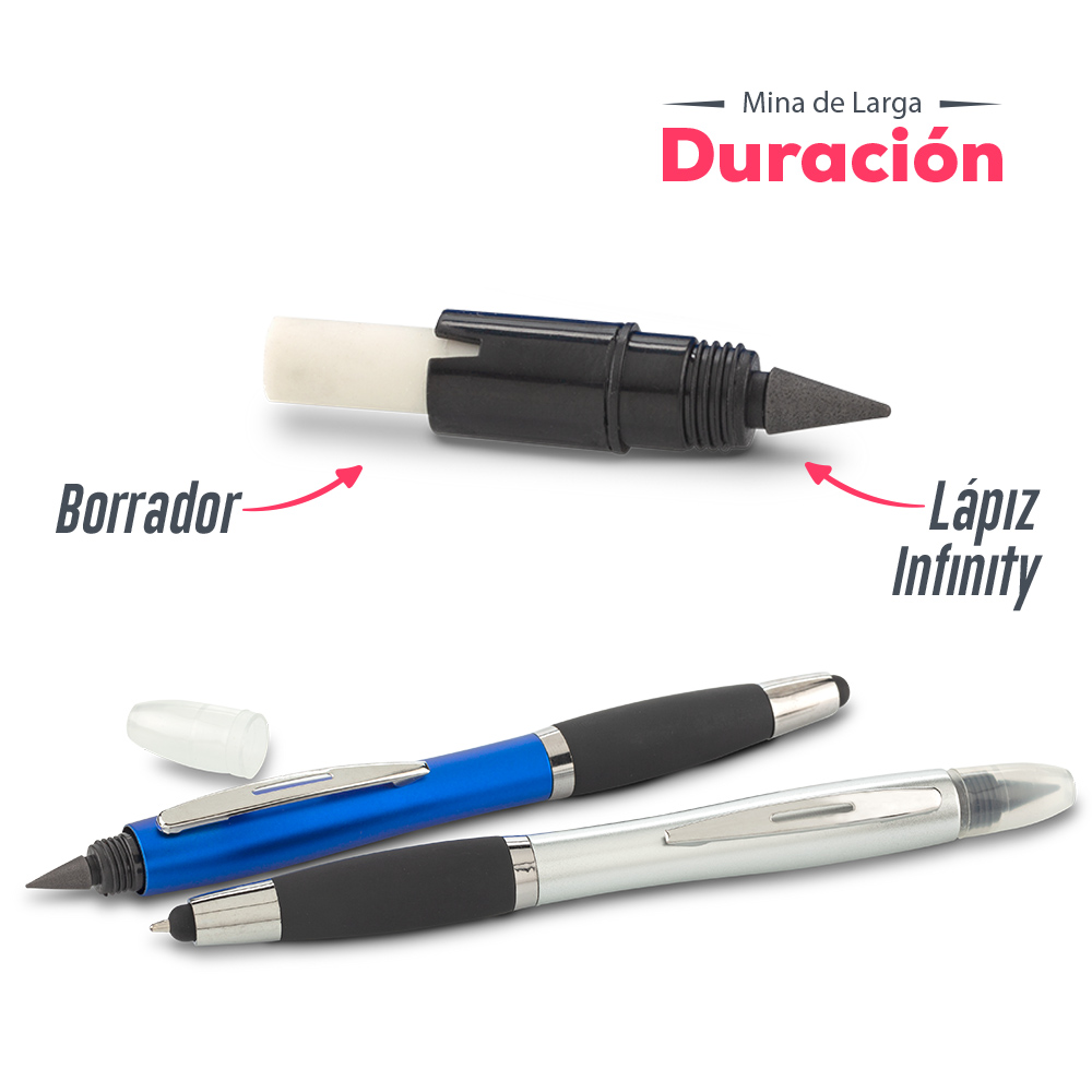 Boligrafo plastico con stylus borrador y lapiz infinity Este producto funciona de una manera innovadora con una mina que no se acaba facilmente no necesita usar tajalapiz La punta frota el papel para descomponer las moleculas de grafito y dejarlas en la superficie de papel; el lapiz borrable se puede aplicar en la mayoria de los papeles y la escritura a mano se puede mantener durante mucho tiempo independientemente de la temperatura o las condiciones climaticas Entre mas suave sea el trazo mas facil sera de borrar